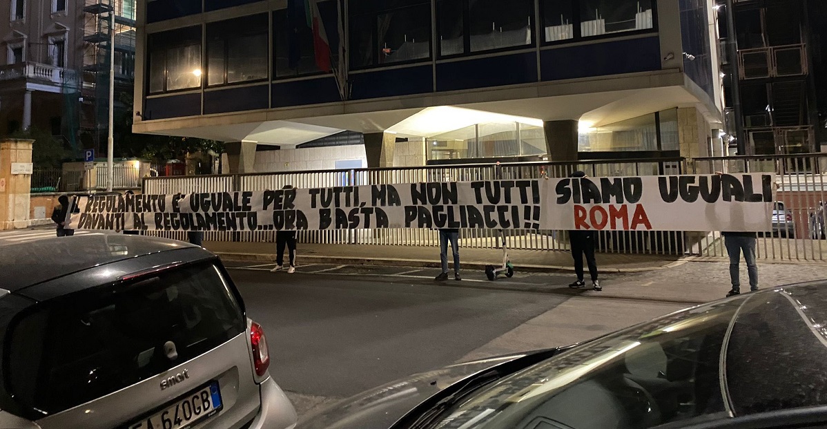 Ore 23:00 – LA PROTESTA DEI TIFOSI A VIA ALLEGRI – La Curva Sud non ci sta e protesta per gli errori arbitrali. I membri del gruppo ‘ROMA’ questa sera hanno esposto uno striscione davanti alla sede della Figc di via Allegri: “Il regolamento è uguale per tutti ma non tutti siamo uguali davanti al regolamento. Ora basta, pagliacci“.