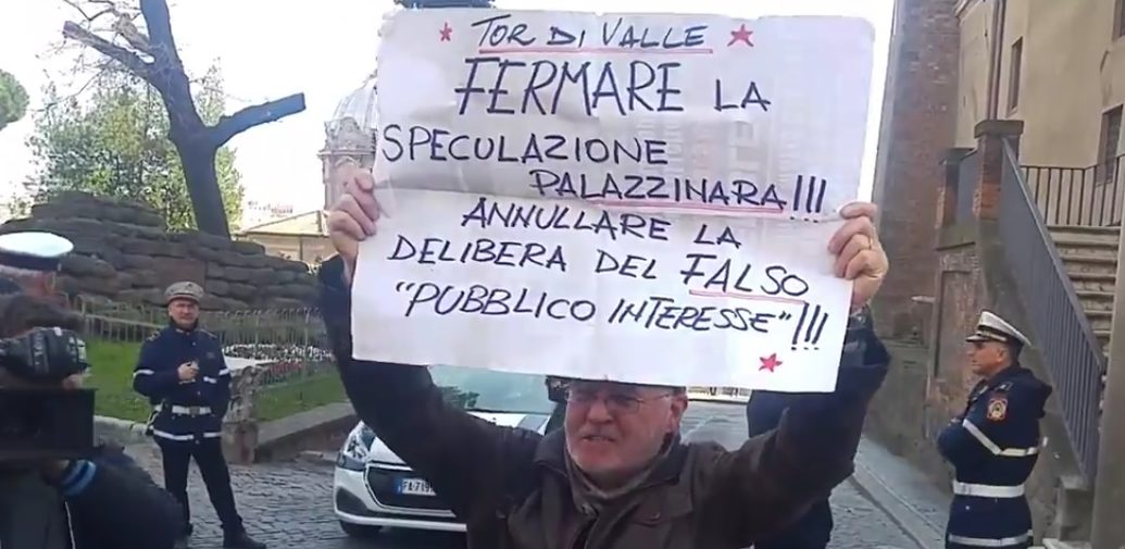 “Cara Virginia, sulla vicenda stadio state prendendo una cantonata! Oltre a non seguire quanto è stabilito nel programma e quanto dichiarato in campagna elettorale e soprattutto il supporto tecnico del Tavolo Urbanistica, che ha evidenziato varie illegittimità nella procedura sin qui espletata dalla vecchia Giunta, state continuando nell’errore!. Il procedimento speciale descritto dal art 1, comma 304, della legge n. 147 del 2014 dice chiaramente che non sono possibili modifiche sostanziali in conferenza di servizi senza addivenire ad un annullamento della delibera di pubblico interesse e ricominciare l’iter. La stampa riporta che avete raggiunto un accordo con una riduzione del 25% di cubatura e corrispondenti opere pubbliche, cosa che determina una palese modifica sostanziale della delibera di pubblico interesse”. La sindaca ha preferito non fermarsi a discutere con gli attivisti, preferendo partecipare alla protesta dei tassisti che si sta svolgendo in queste ore a Roma.