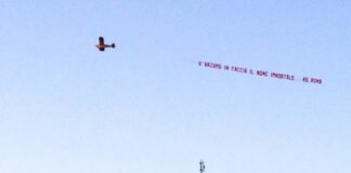 Aeroplano sopra l’Olimpico: “V’arzamo in faccia il nome immortale…As Roma” (FOTO)