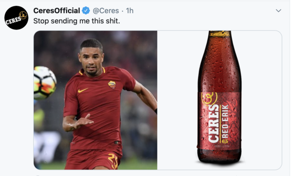 AS ROMA NEWS – Dopo la gaffe, arrivano le scuse. Ceres, marchio di una nota birra, ha dovuto fare marcia indietro dopo un tweet a dir poco grottesco nel quale accostava il giocatore giallorosso Bruno Peres al proprio prodotto con un cinguettio con su scritto: “Stop sending me this shit” (“Smettetela di mandarmi questa mer*a“, la traduzione letterale).