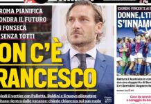 ULTIME AS ROMA - "Non c'è Francesco". Apre così l'edizione romana del Corriere dello Sport oggi in edicola. Il quotidiano sottolinea dunque l'assenza di...