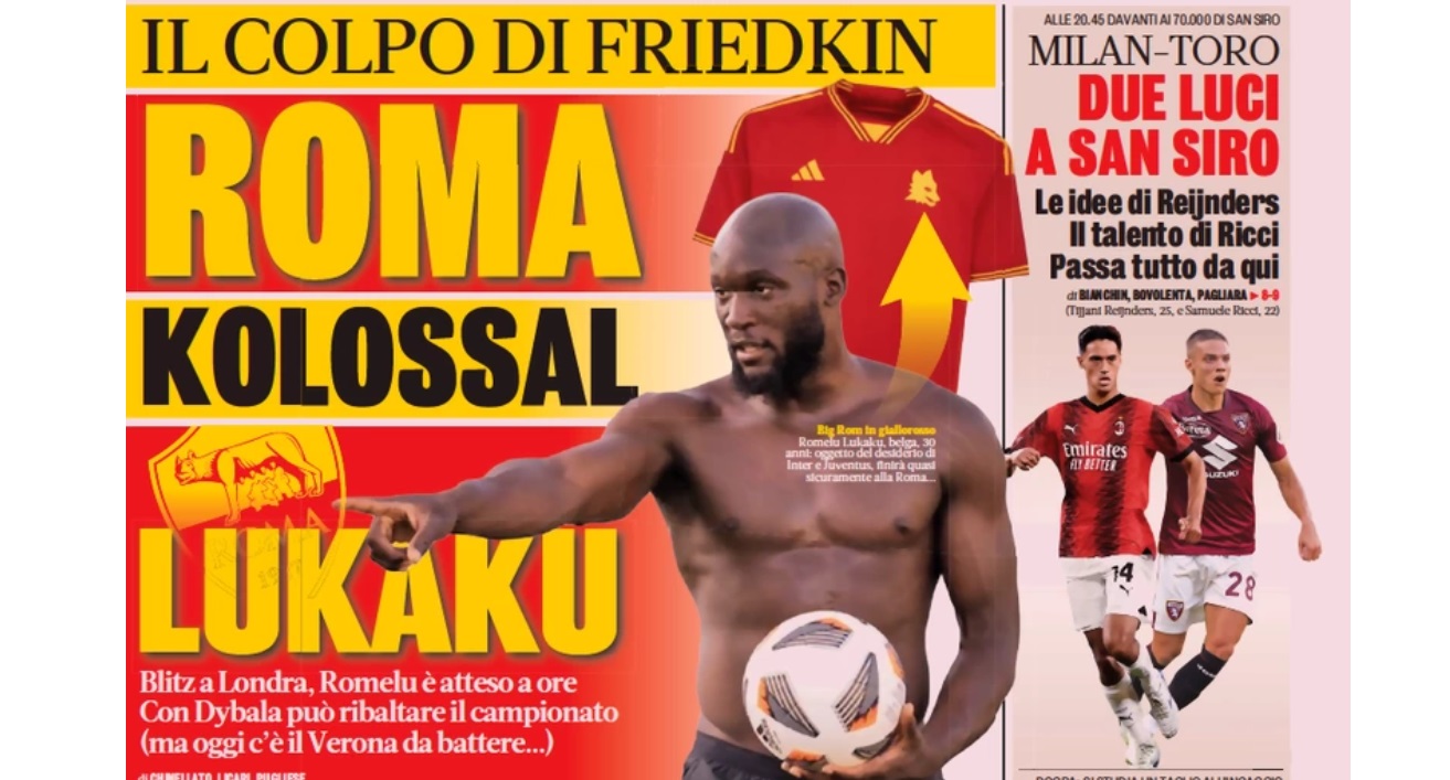 Apertura a tutta pagina anche per la Gazzetta dello Sport, che scrive: “Roma Kolossal Lukaku. Il colpo dei Friedkin: blitz a Londra, Romelu è atteso a ore. E con Dybala può ribaltare il campionato“. Per la Gazzetta il nuovo duo d’attacco ricorda quello formato da Charles e Sivori tanti anni fa nella Juventus.