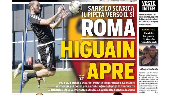 “Roma, Higuain apre”, il titolo del quotidiano che apre l’edizione romana. I due club ormai sono d’accordo: Pallotta gli garantisce 4,5 milioni a stagione più bonus per 4 anni, mentre la Juve è disposta a pagargli una buonuscita.