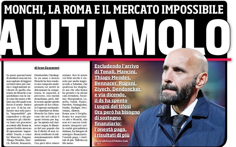 Il ds ha infatti escluso, afferma il giornale, gli arrivi di Bennacer, Tonali, Ozyakup, Mendes, Rugani e Dendonker, gelando così la tifoseria romanista. Ora però Monchi, prosegue il Corriere dello Sport in prima pagina, ha bisogno di sostegno finanziario.