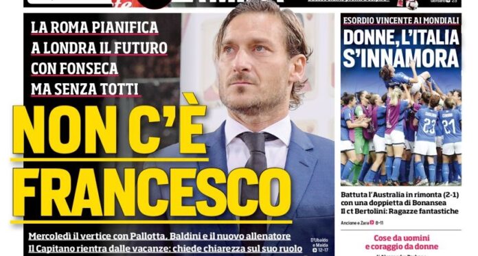 ULTIME AS ROMA – “Non c’è Francesco“. Apre così l’edizione romana del Corriere dello Sport oggi in edicola. Il quotidiano sottolinea dunque l’assenza di Totti nel viaggio che la dirigenza del club affronterà nei prossimi giorni a Londra per incontrare Pallotta, Baldini e il nuovo allenatore Paulo Fonseca.