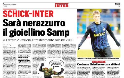 Il quotidiano sportivo titola così: “Schick-Inter: sarà nerazzurro il gioiellino Samp”. L’accordo è stato raggiunto per 25 milioni di euro (che poi altro non sarebbe che il prezzo della clausola rescissoria, ndr), con l’attaccante che resterà un altro anno in blucerchiato e i trasferirà a Milano solo nel 2018.