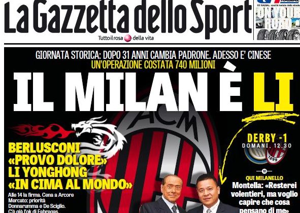 LE PRINCIPALI NOTIZIE DAI QUOTIDIANI IN EDICOLA – Gazzetta dello Sport e Corriere dello Sport celebrano in prima pagina il passaggio di consegne del Milan ai cinesi, ricordando tutti i successi vissuti dai rossoneri nell’era Berlusconi. Pensa in grande il nuovo presidente dei rossoneri, Yonghong Li, che assicura grandi investimenti: “Sarà di nuovo un Milan mondiale“.