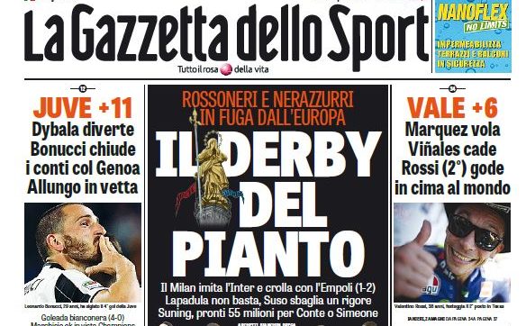 TUTTO IL CALCIO SUI QUOTIDIANI – Milan e Inter in fuga…dall’Europa. Periodo nerissimo per le due squadre milanesi, che perdono e fanno figuracce. Dopo il rocambolesco ko dei nerazzurri contro la Fiorentina, scrive il Corriere dello Sport, l’allenatore Stefano Pioli ha rassegnato le sue dimissioni, respinte però dalla proprietà cinese: si va ancora avanti con lui, fino al termine della stagione. Poi però spazio a un nuovo tecnico: per la Gazzetta dello Sport il sogno è arrivare a uno tra Conte e Simeone (pronti 55 milioni di euro per convincere uno dei due), altrimenti Spalletti sarà il grande favorito.