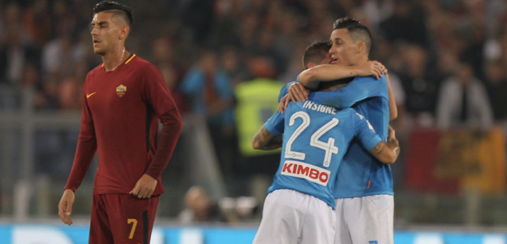 AS ROMA NEWS – È’ l’anno del Napoli? Si direbbe di sì. Il verdetto dell’Olimpico, dopo quanto accaduto a Torino, è abbastanza chiaro e tutto sommato giusto. Sarri batte per il secondo anno di fila la Roma a domicilio e infila l’ottava vittoria su otto gare, Di Francesco s’arrende e deve fare un passo indietro dopo il blitz di San Siro. Ma è una sorta di sorpasso più ampio e forse definitivo quello che viene compiuto nel sabato di campionato: in colpo solo il Napoli vola a +5 dalla Juventus e stacca di nove lunghezze (anche se con una gara giocata in più) l’avversaria che l’ha sovrastata per tre volte nelle ultime quattro stagioni. La sfida dell’Olimpico non delude le attese. Intensa fino all’ultimo e vinta ai punti dalla squadra in questo momento migliore. Non solo della Roma. Bell’avvio tattico, con due formazioni che si studiano e contendono ogni pallone. Di Francesco opta per il modulo «spallettiano», avanzando Nainggolan in pressione su Jorginho in un 4-2-3-1 abbastanza evidente sin dall’avvio. Sarri non ha bisogno di inventarsi granché, la sua squadra ha imparato a memoria uno spartito contro cui ogni mossa di disturbo sembra ininfluente. Per una ventina di minuti la Roma tiene botta e promette bene. Aggressiva, convinta e pronta a ripartire appena possibile. Ma non tira mai in porta.