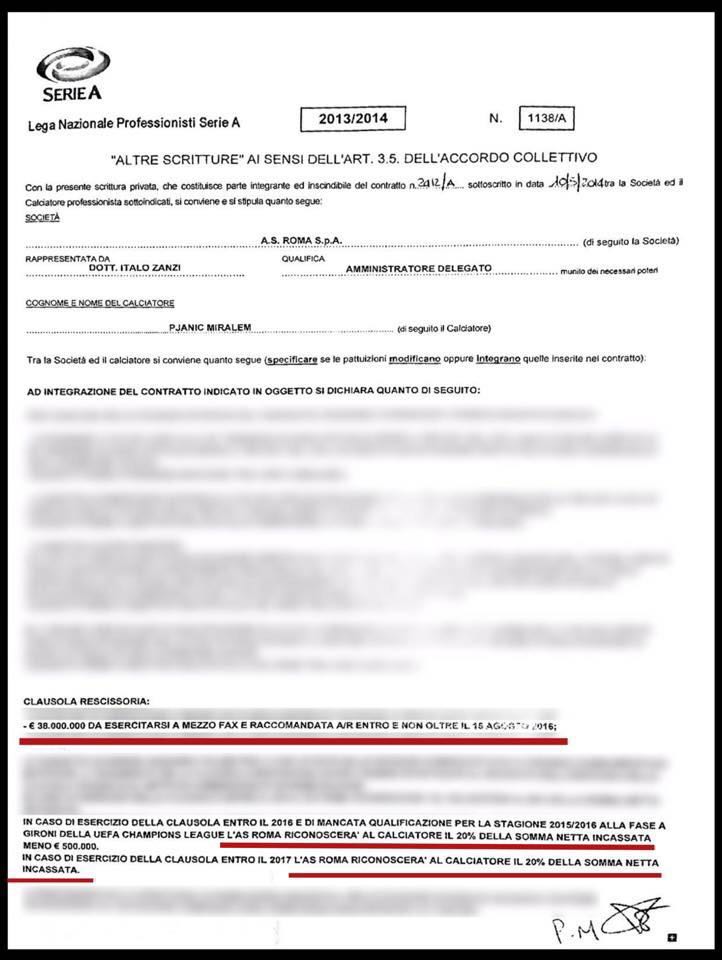 Il documento rivela che la clausola rescissoria ammonta a 38 milioni di euro da esercitarsi entro, e non oltre, il 15 agosto 2016. In caso di esercizio della clausola entro il 2016 e di mancata qualificazione per la stagione 2015/2016 alla fase a girone della UEFA Champions League la AS Roma riconoscerà al calciatore il 20% della somma netta incassata meno 500 mila euro. In caso di esercizio della clausola entro il 2017 la AS Roma riconoscerà al calciatore il 20% della somma netta incassata.