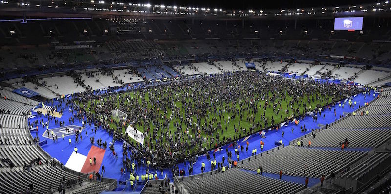 Tifosi sul campo da gioco dello Stade de France, Parigi, 13 novembre 2015. (FRANCK FIFE/AFP/Getty Images)