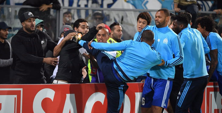 Il particolare bizzarro è che a beccarsi il calcione è stato un tifoso francese. Tutto succede prima del fischio d’inizio della partita di Europa League tra i portoghesi del Vitoria Guimaraes e il Marsiglia. Attimi di tensione che sono sfociati nella rissa quando un gruppo di tifosi transalpini sono entrati in campo, con i cartelloni pubblicitari a dividerli dalla squadra. A quel punto però Evrà ha pensato bene di giocare di anticipo e sferrare un colpo. L’arbitro però era lì e ha espulso il calciatore, che quindi non ha potuto disputare il match. La situazione poi è tornata alla normalità , con la partita che si è disputata regolarmente e ha visto prevalere i portoghesi per uno a zero.Â