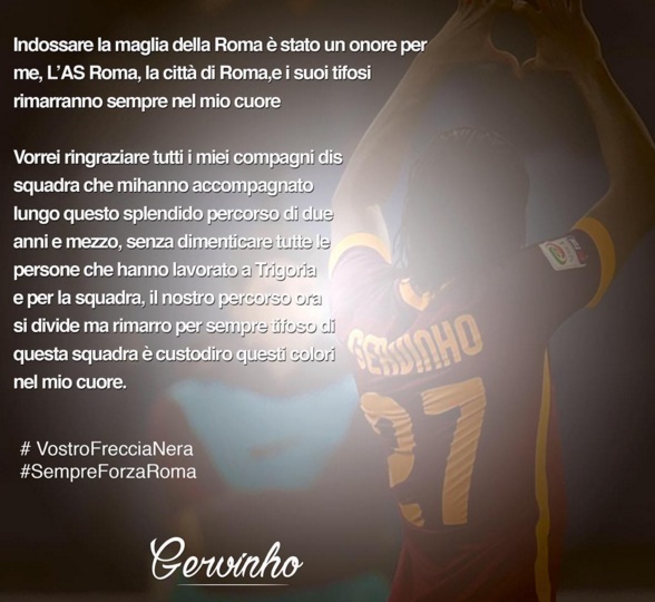 “Indossare la maglia della Roma è stato un onore per me, l’As Roma, la città di Roma e i suoi tifosi rimarranno sempre nel mio cuore. Vorrei ringraziare tutti i miei compagni di squadra che mi hanno accompagnato ungo questo splendido percorso di due anni e mezzo, senza dimenticare tutte le persone che hanno lavorato a Trigoria e per la squadra, il nostro percorso ora si divide ma rimarrò sempre tifoso di questa squadra e custodirò questi colori nel mio cuore. Vostro Freccia Nera, sempre Forza Roma”.