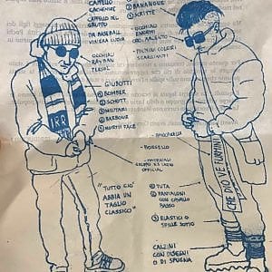 Nell’immagine sul retro del foglietto, bianco con testo in azzurro perché “lo stile esteriore” è importante ma i colori sociali di più, compaiono allora i disegni nemmeno troppo stilizzati di due figure: da una parte, il “vero” laziale. Che veste rigorosamente “casual”, e quindi indossa, come da didascalie accanto al disegno, “cappello di cachemire o cappello del gruppo“, al massimo “da baseball con visiera curva”. Occhiali da sole solo Ray-Ban o Persol, giubotti come bomber, militari, oppure di marche specifiche: ovviamente, in stile casual. Scarpe New Balance o Clarks, con tolleranza verso le Adidas. Insomma, da pariolino, o al massimo di “Roma nord”: il tipo da aperitivo a Ponte Milvio, ecco. Arricchito ovviamente dalla sciarpa: del gruppo – dunque, degli Irriducibili, come si vede dalla sigla “Irr” nel disegnino – o del merchandising ufficiale della Lazio. Non delle bancarelle, come quella che invece indossa, legata in vita (e con la scritta, tipicamente romanista, “che dio ve furmini”), l’immagine del tifoso che in Curva Nord rigettano. Lo indicano sotto la scritta “Gli altri”, per esser chiari. E sono quelli con i capelli con il “doppio taglio, il “bananone” (ossia il ciuffo all’indietro) o le scritte. E poi, quelli che portano “occhiali enormi oro e argento, i piumini con colori sgargianti, tuta o o pantaloni col cavallo basso”, magari tenuti alzati sulla caviglia con il risvoltino. E ancora, i calzini di spugna, scarpe con il carrarmato, o le borchie. Insomma, per il “coatto” in Nord non v’è posto.