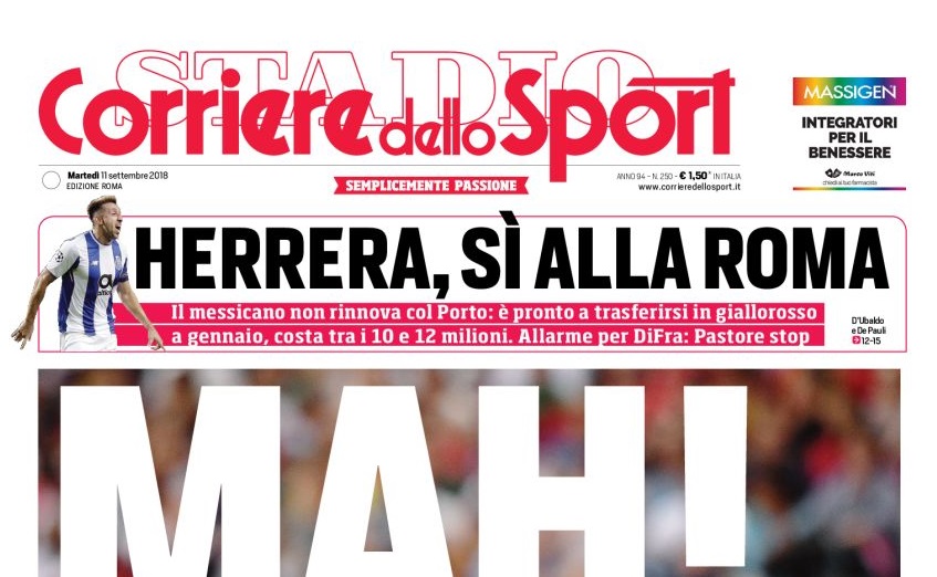 E’ da qualche giorno che il Corriere dello Sport spinge su questa ipotesi, e oggi il quotidiano si sbilancia scrivendo dell’accordo raggiunto tra il mediano del Porto e il club giallorosso. “Herrera dice sì alla Roma”, titola l’edizione capitolina del quotidiano sportivo.