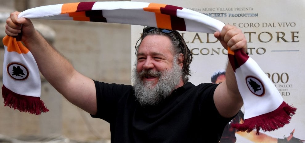 Ieri è sbarcato ai Parioli, al Forum Music Village di piazza Euclide, Russell Crowe, irriconoscibile, barbuto e appesantito, urlando «Forza Roma!» tendendo la sciarpa giallorossa alla presentazione stampa dell’evento. «Io sono al servizio di Roma», ha detto. Mai parole più azzeccate oggi che la Caput Mundi ha bisogno smisurato del supporto di tutti solo guardandola. Si incontrerà stasera al Colosseo, dove andrà in scena la prima proiezione del memorabile film, con Francesco Totti (l’As Roma è tra i partner dell’evento).