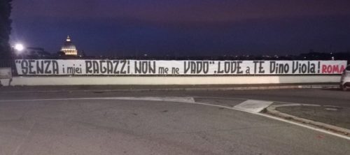 AS ROMA NEWS – 19 gennaio 2018, 27 anni dalla scomparsa del grande Presidente romanista Dino Viola. Il Gruppo ROMA ha voluto rendere omaggio con uno striscione che recita una frase storica dell’ex numero uno giallorosso: “Senza i miei ragazzi non me ne vado“, dedicato proprio ai tifosi. Questo il testo completo: “Senza i miei ragazzi non me ne vado”. Lode a te dino Viola!” ROMA“.