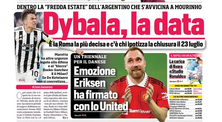Per Tuttosport invece la Roma sembra essere fuori dai giochi: secondo il giornale di Torino, Dybala aspetta l’Inter ma il Napoli è in forte pressing, con De Laurentiis pronto a regalare l’argentino ai suoi tifosi nel solco di Maradona.