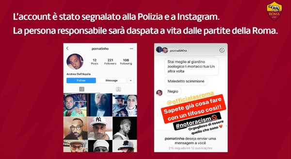 IL COMUNICATO – Questo il comunicato del club, apparso su Twitter in serata: «Il gestore di questo account Instagram (Pomatinho, il nick name, ndc) ha inviato insulti razzisti disgustosi a Juan Jesus, attraverso un messaggio diretto. Abbiamo segnalato l’account alla Polizia e a Instagram. La persona responsabile sarà daspata a vita dalle partite della Roma». Un’iniziativa che in qualche modo Juan Jesus s’era augurato nella replica garbata avuta sul social. Inizialmente il difensore brasiliano ha risposto girando la conversazione sul profilo ufficiale del club giallorosso, per poi aggiungere il proprio commento: «Sapete già cosa fare con un tifoso così. Orgoglioso di essere quello che sono».