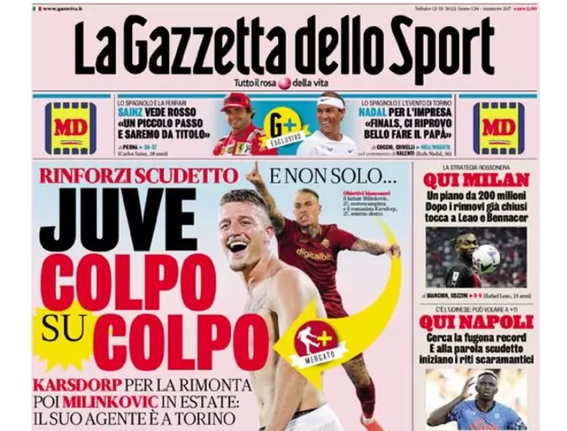 “Juve, colpo su colpo” titola il quotidiano sportivo milanese. Il primo rinforzo dei bianconeri per gennaio sarebbe proprio Rick Karsdorp, mentre in estate si punta tutto su Milikovic-Savic.