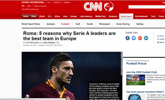 AS ROMA NEWS (CNN.COM) – Anche dal notissimo network statunitense, si studia la Roma e i motivi del suo successo. Ne trovano ben 5 oltreoceano: Rudi Garcia, il calciomercato estivo, la difesa imperforabile, Francesco Totti e Gervinho. Sul tecnico francese, è Philippe Auclair, esperto di calcio transalpino, a tratteggiare il profilo dell’allenatore giallorosso: “Ha una personalità molto forte. Di recente ho parlato con Hazard e lui parlava con insistenza della cura maniacale di Mourinho per i compiti difensivi. Ha detto che l’approccio è simile a quello che aveva Garcia al Lille e questo la dice lunga sulla completezza della sua preparazione”.
