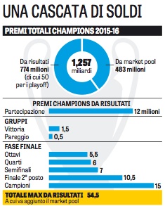 PREMI DA RISULTATI I premi si distinguono sem- pre in due voci: risultati e market-pool. Quelli sportivi, 724 milioni, compongono il 60% del montepremi totale per i club. Il market pool, col- legato ai valori dei contratti televisivi delle singo- le nazioni, vale invece 483 milioni (il 40%). Ri- spetto al triennio precedente è aumentato, giu- stamente, l’impatto dei premi sportivi (il rappor- to era 527-431 milioni, cioè 55-45%). Partecipare ai gruppi significa incassare 12 mi- lioni, anche perdendo tutte le partite. Conquista- re la coppa con sei successi nel gruppo vale 54,5 milioni, il massimo possibile. E da quest’anno c’è anche un piccolo paracadute di 50 milioni totali per chi esce nei play-off. Ma non è finita.