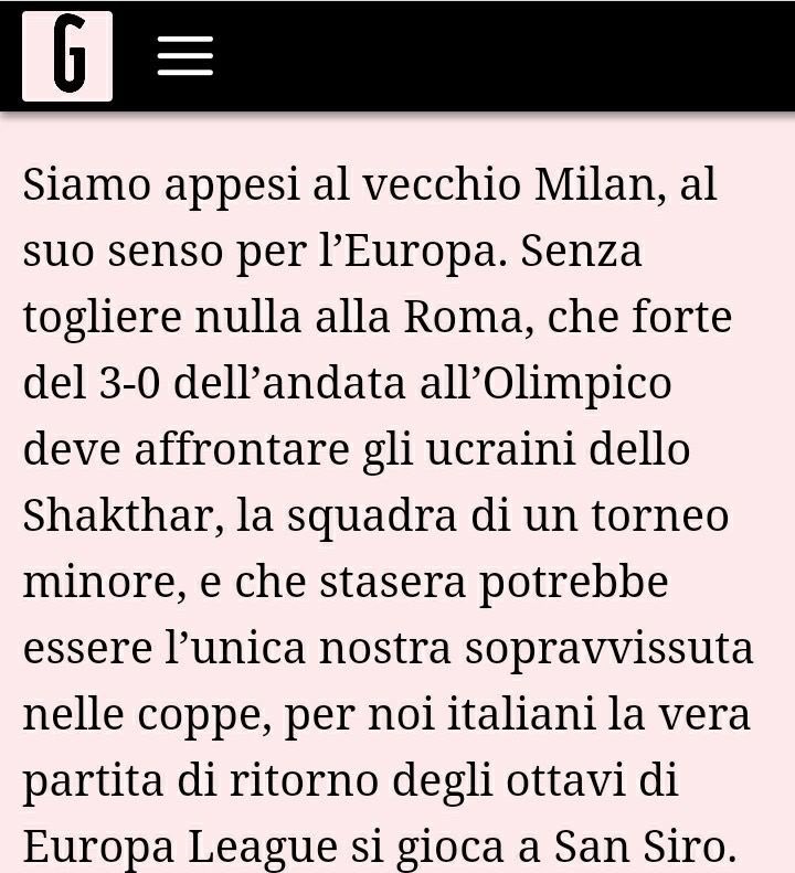 scrivo relativamente al Suo articolo nel quale esorta il milan a riscattare il calcio italiano precisando che la Roma non può essere investita di cotanta nobile missione visto che incontra lo Shakthar “la squadra di un torneo minore” e che, a suo scrivere, “per noi italiani la vera partita di ritorno degliottavi di Europa League si gioca a San Siro”.