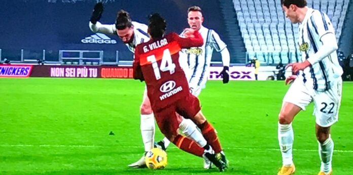 Contatto non clamoroso… a me pare che Villar faccia una gran giocata spostando il pallone e Rabiot lo prenda… Qui non è una cosa tipo prendo palla e piede, o una spinta di cui è difficile da verificare l’entità… qui è un contatto che chiaramente impedisce a Villar di continuare. Contatti del genere Orsato li ha fischiati per tutta la partita!