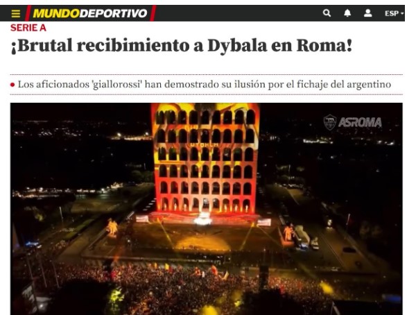 L’incredibile accoglienza dei tifosi della Roma per la presentazione di Dybala“, è il titolo che riserva L’Equipe all’evento di ieri. Dello stesso tenore il titolo del Mundo Deportivo, che usa il termine “Brutal” (“enorme“) per raccontare la festa della Roma al suo nuovo calciatore.