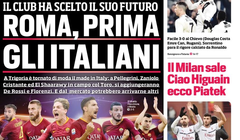 ULTIME AS ROMA – “Roma, prima gli italiani“. E’ l’apertura del Corriere dello Sport di oggi nell’edizione capitolina. Il club ha scelto il suo futuro: spazio al made in Italy.