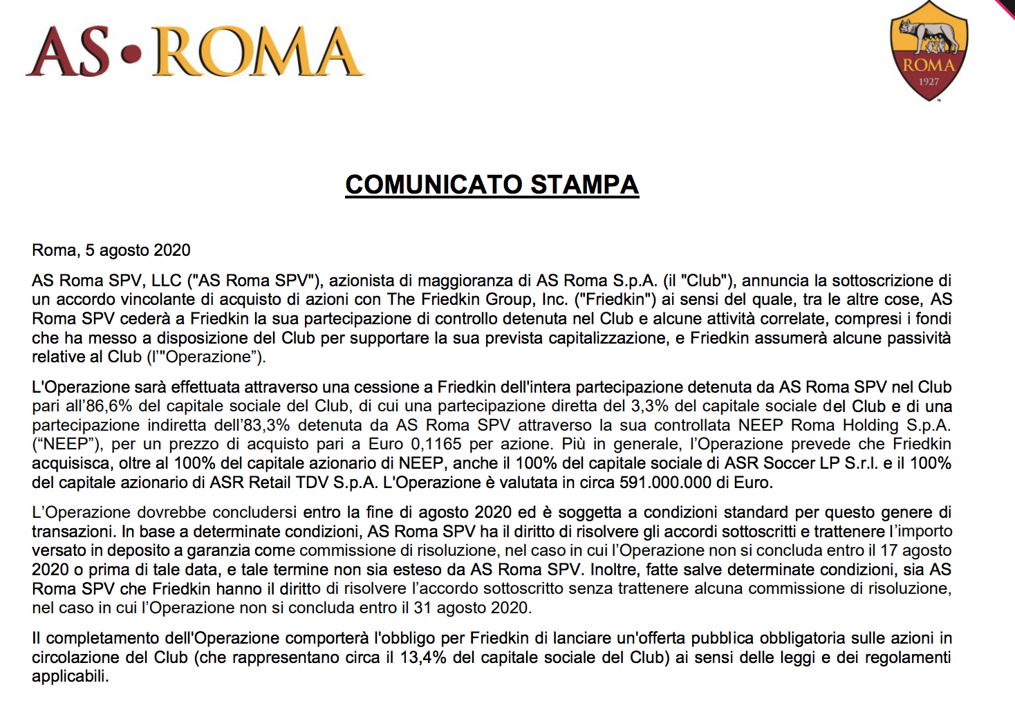 “AS Roma SPV, LLC (“AS Roma SPV”), azionista di maggioranza di AS Roma S.p.A. (il “Club”), annuncia la sottoscrizione di un accordo vincolante di acquisto di azioni con The Friedkin Group, Inc. (“Friedkin”) ai sensi del quale, tra le altre cose, AS Roma SPV cederà a Friedkin la sua partecipazione di controllo detenuta nel Club e alcune attività correlate, compresi i fondi che ha messo a disposizione del Club per supportare la sua prevista capitalizzazione, e Friedkin assumerà alcune passività relative al Club (l’”Operazione”).