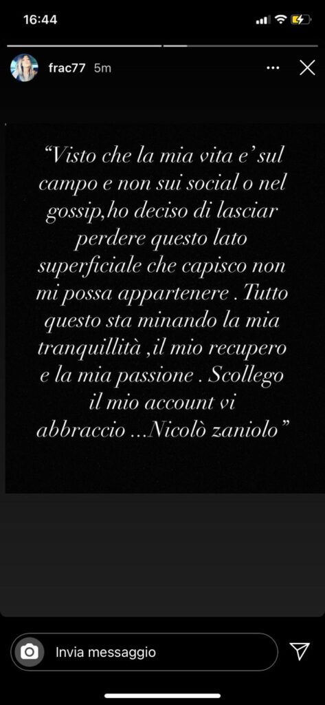 AS ROMA NEWS – Nicolò Zaniolo dice basta coi social. Il giocatore, visti i recenti sviluppi polemici intorno alla sua vita privata e al clamore che si sta scatenando intorno, ha deciso di chiudere i suoi account.