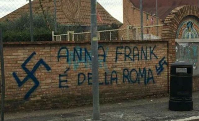 ULTIME NOTIZIE AS ROMA – Antisemitismo e sport, il caso Anna Frank sbarca, purtroppo, anche a Lavinio. La scritta, corredata da svastiche, “Anna Frank è della Roma” è apparsa ieri sul muro del Centro Ecumenico. Il riferimento, chiaro, è al caso scoppiato qualche settimana fa con i tifosi della Lazio che avevano affisso delle figurine della bambina ebrea morta nel campo di concentramento di Bergen-Belsen nella seconda guerra mondiale, vestita con la maglia della Roma in Curva Sud.