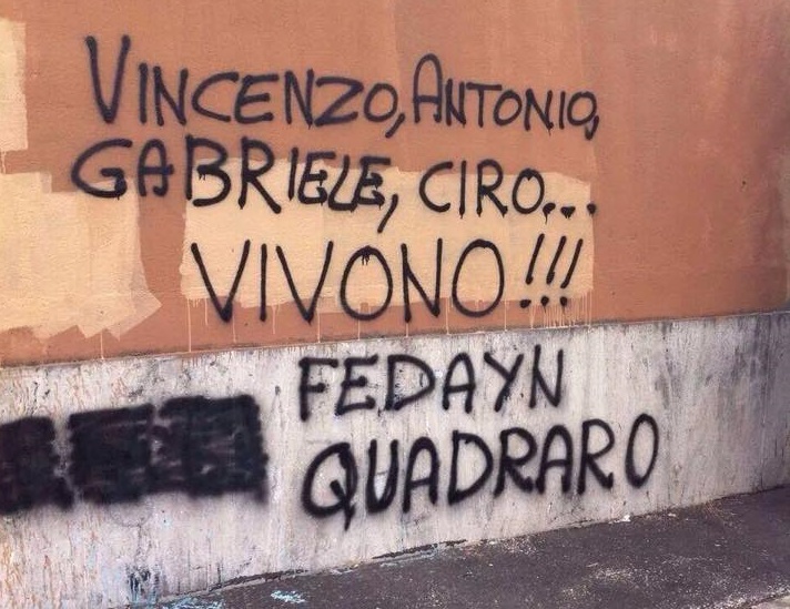 Poco dopo il colpo di scena. A prendere il posto degli insulti, coperti da uno strato di vernice, spunta un messaggio diverso, stavolta firmato Fedayn Quadraro, colonna dello storico gruppo ultras della Roma: «Vincenzo, Antonio, Gabriele, Ciro… Vivono!!!». Un gesto apprezzato dalla tifosera biancoceleste, quello di sostituire un messaggio di odio con il ricordo di quattro ragazzi morti per una partita di calcio. Il riferimento è naturalmente a Paparelli accomunato agli altri tifosi vittime della violenza e della follia. Antonio De Falchi, il tifoso giallorosso pestato a morte nell’89 a soli 19 anni davanti a San Siro. Gabriele Sandri, il giovane laziale ucciso nel 2007 da un colpo di pistola sparato dal poliziotto Luigi Spaccarotella in un’area di servizio sull’A1. E naturalmente Ciro Esposito, il tifoso del Napoli morto in seguito al colpo di pistola sparato dal tifoso della Roma Daniele De Santis nei pressi dell’Olimpico prima di Napoli-Fiorentina, finale di coppa Italia della scorsa stagione. La partita della «trattativa» e di Genny «’a Carogna» che ha segnato uno spartiacque nel mondo ultrà.