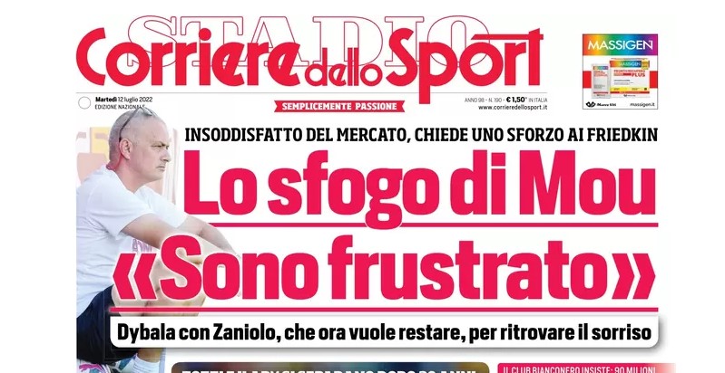 Stando a quanto scrive oggi il giornale sportivo, l’allenatore giallorosso Josè Mourinho ha manifestato la propria insoddisfazione per il mercato operato da Tiago Pinto, ammettendo di essere “frustrato”.
