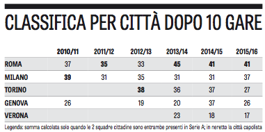 TRANELLO CAPITALE Del resto è dalla stagione 2010-11 che Inter e Milan non sono più in vetta a questa speciale graduatoria. Nel mezzo c’è stato il dominio della Juve che evidentemente a messo a nudo le criticità delle società meneghine, che un anno fa vedevano erano addirittura al quarto posto nella classifica per città . I copiosi investimenti estivi dimostrano che è tanta la voglia di riscatto di nerazzurri e rossoneri. Nel frattempo, però, a Roma non sono rimasti con le mani in mano. Il club di Pallotta ha continuato a spendere per il sogno-scudetto, mentre Lotito ha irrobustito il suo progetto verde. La concorrenza è ancora temibile, visto che Napoli e Fiorentina hanno un gran bel passo. Nell’anno della grande ammucchiata è dura sbilanciarsi in previsioni troppo presto. È certo, però, che tutti corrono il rischio-frenesia con la conseguenza di alzare inconsapevolmente l’asticella delle difficoltà . Occhio, insomma, al tranello capitale.