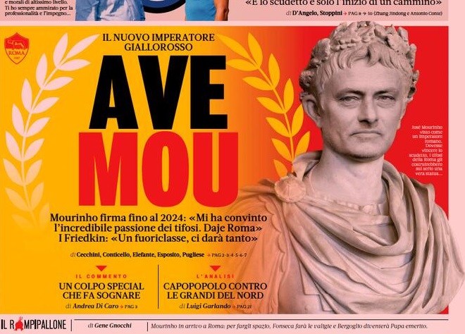 “Ave Mou, il nuovo imperatore giallorosso“, apre la Gazzetta dello Sport a tutta pagina. “Un colpo Special che fa sognare. La Roma mette a segno, forse, il colpo mediatico più importante della sua storia, prendendo uno dei tecnici più vincenti di sempre. Mou è il simbolo di un rilancio in grande stile che proietta la Roma tra i top club europei e rappresenta garanzia di leadership.