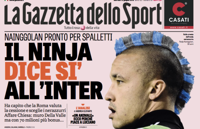 ULTIMISSIME CALCIOMERCATO ROMA – “Il Ninja dice sì all’Inter“. E’ questo il titolo che apre l’edizione odierna della Gazzetta dello Sport, che a pagina 2 e 3 dedica ampio spazio al possibile approdo di Nainggolan in nerazzurro. Radja ha dato più di un’apertura al trasferimento a Milano e può essere il grande regalo per Spalletti, l’uomo in più a centrocampo per alzare il livello della squadra. Una volta risolti i problemi con il fair play e racimolati i 45 milioni di plusvalenze entro il 30 giugno, il d.s. Piero Ausilio (che ha già incontrato l’agente del belga, Alessandro Beltrami) andrà all’attacco: la trattativa è a un passo dal decollare, l’interesse dell’Inter è concreto e il contatto tra i club ha smosso le acque. Nainggolan ha capito che forse il suo tempo nella Roma è finito e accetterebbe il passaggio in nerazzurro; Spalletti ha piazzato da sempre Radja in cima alla lista della spesa; la Roma resta alla finestra, pronta a valutare l’offerta nerazzurra, e sta comunque considerando l’idea di privarsi del trequartista belga.