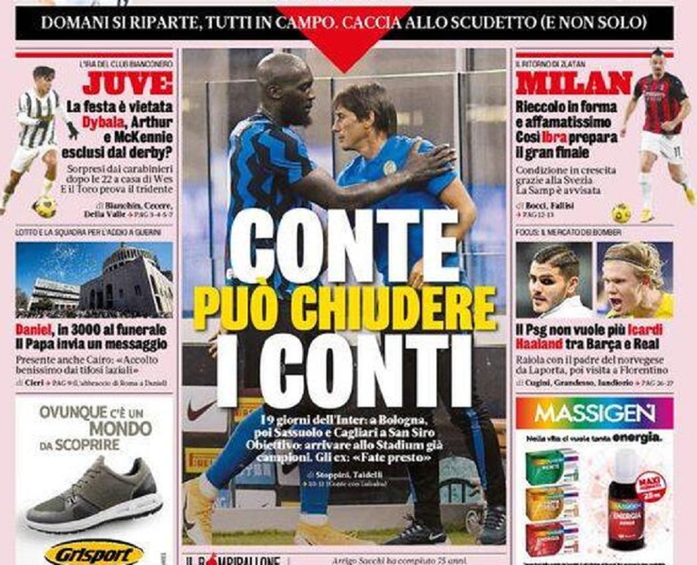 ALTRE NOTIZIE – “Conte può chiudere i conti”. E’ questa l’apertura della Gazzetta dello Sport di oggi: la squadra ha nove giorni per chiudere il discorso scudetto. Affronterà Bologna, Sassuolo e Cagliari: l’obiettivo è arrivare alla sfida dello Stadium già da campioni d’Italia.