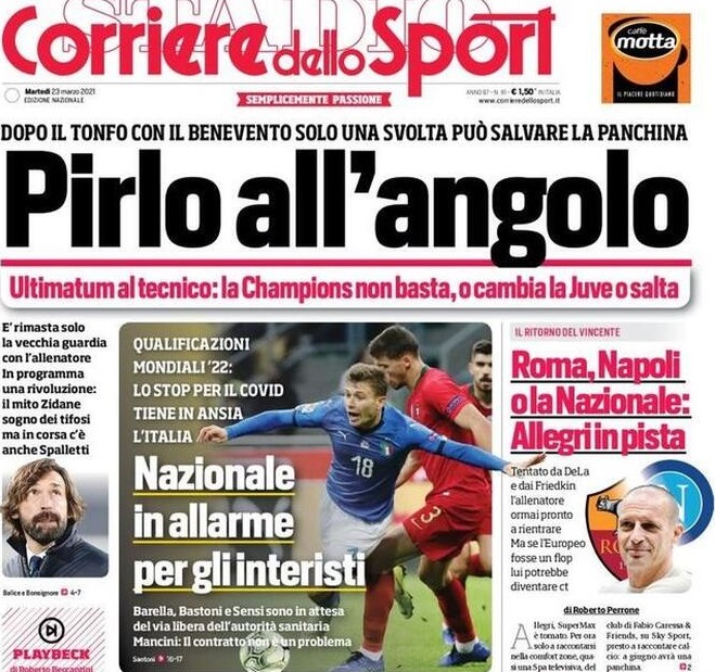 “Pirlo all’angolo” titola il Corriere dello Sport in apertura. “Ultimatum al tecnico: la Champions non basta. O cambia la Juve o salta“. Di spalla si parla però di Allegri: Roma, Napoli o la Nazionale (se l’Europeo dovesse essere un flop).