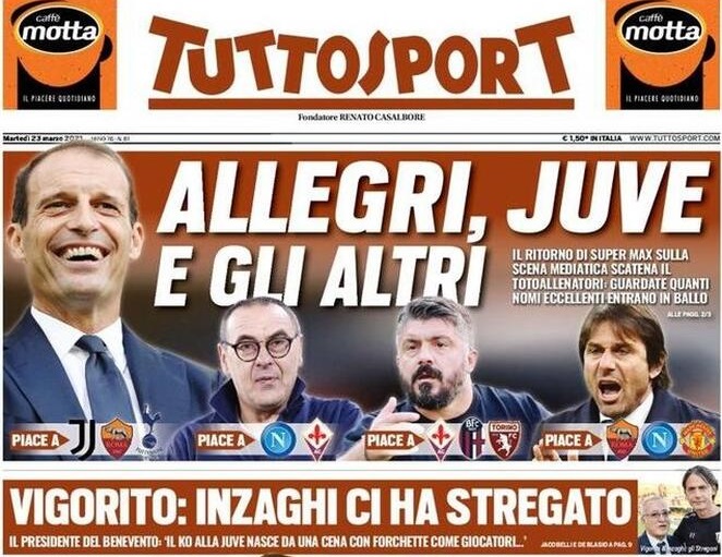 ALTRE NOTIZIE – Il ritorno sulle scene di Max Allegri scatena la fantasia dei giornali sportivi, che oggi si concentrano sulle panchine in bilico e sul toto allenatori.