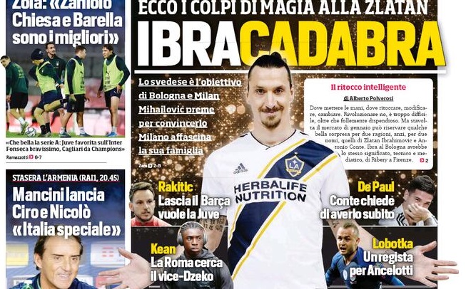 CORSPORT: “IBRACADABRA” – Zlatan Ibrahimovic in primo piano sul Corriere dello Sport di oggi che apre con il titolo “Ibracadabra“. L’attaccante svedese sembra essere il sogno del Bologna, con Mihajlovic che sta cercando di convincerlo a sposare il progetto degli emiliani. Il Milan sembra restare sullo sfondo, ma la piazza affascinerebbe di più la famiglia di Ibrahimovic.