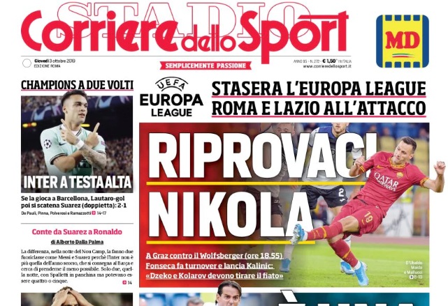 Della Roma si occupa solo il Corriere dello Sport che nell’edizione romana titola “Riprovaci Kalinic”, alludendo ai due errori sotto porta del croato nei match giocati con la maglia giallorossa. Stasera l’attaccante ex Fiorentina e Milan proverà a sbloccarsi contro il Wolfsberg.