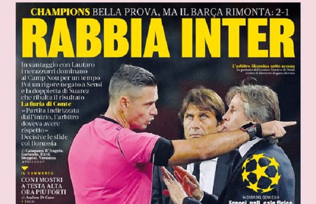 “Rabbia Inter”, titola la Gazzetta dello Sport, sottolineando la bella prova della squadra nerazzurra al Camp Nou ma anche una svista arbitrale che nega un rigore a Sensi. L’Inter, scrive il giornale, domina per 60 minuti, poi Suarez la ribalta.