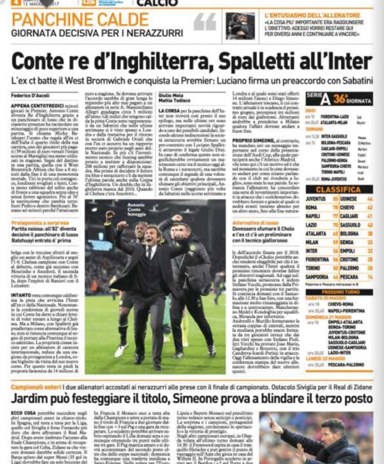C’è qualcosa che non quadra? L’inter (Inda, nel resto del mondo) è piena di soldi e ingaggia come DS il re delle plusvalenze. Il suo allenatore non considerava minimamente i giovani che aveva acquistato, gli vogliono affiancare di nuovo Spalletti. I giornalai hanno già venduto mezza Roma all’inter, ma le dichiarazioni di Sabatini su Gerson sono state chiare. Lo vuole con lui. Spalletti ha già messo come clausola che farà giocare Gerson solo contro la Juve, infatti per Roma-Juve Allegri si aspetta la mossa Gerson davanti alla difesa. Ma quale delle due?