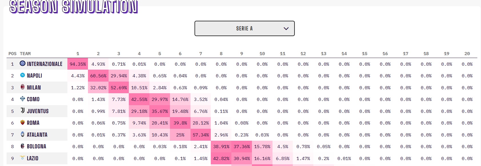 Situazione diversa per le dirette concorrenti. La Juventus, oggi quinta e a un solo punto dal Como, ha il 29,18% di possibilità di centrare la qualificazione in Champions. Ancora più alte le percentuali del Como, attualmente quarto, che secondo il modello di Opta è la principale candidata a mantenere la posizione, con il 42,55% di probabilità.