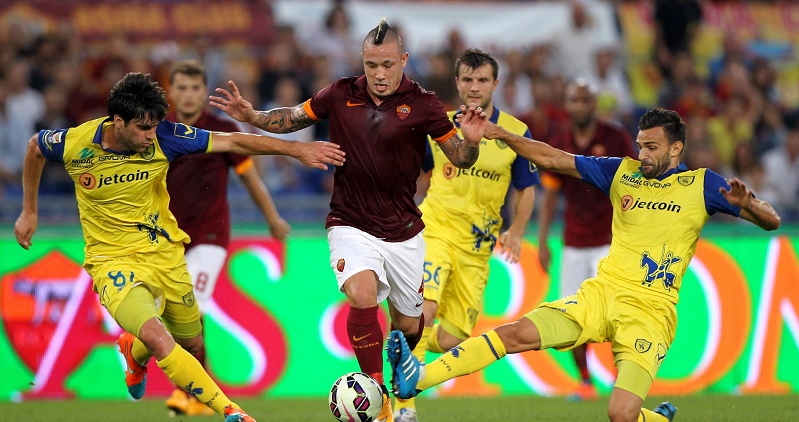 ROME, ITALY - OCTOBER 18: Radja Naiggolan (C) of AS Roma competes for the ball with AC Chievo Verona players during the Serie A match between AS Roma and AC Chievo Verona at Stadio Olimpico on October 18, 2014 in Rome, Italy. (Photo by Paolo Bruno/Getty Images)