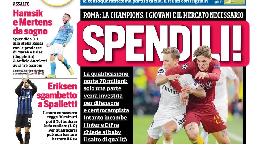 ULTIME NOTIZIE AS ROMA – Il Corriere dello Sport, nell’edizione romana, esorta Pallotta a tirare fuori i soldi e a rinforzare la Roma a gennaio. Molto chiaro il titolo che apre la prima pagina: “Spendili!”, scrive il quotidiano, facendo riferimento ai 70 milioni che il club incasserà dal raggiungimento degli ottavi di Champions.