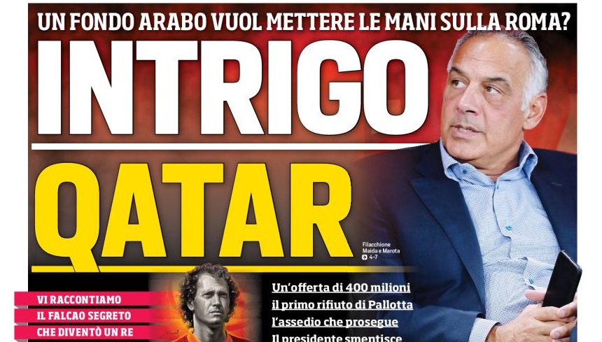 “Intrigo Qatar”, titola a tutta pagina il quotidiano sportivo oggi in edicola. “Un fondo arabo vuole mettere le mani sulla Roma?“, si domanda il giornale. A quanto pare sembrerebbe proprio di sì, visto che il giornale racconta di una prima offerta di 400 milioni arrivata sul tavolo di Pallotta e rispedita al mittente.