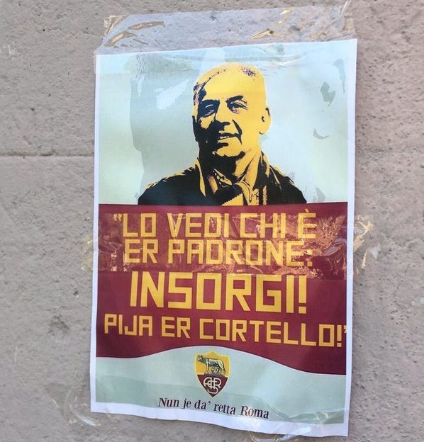 Il manifesto in questione è stato affisso ieri pomeriggio, prima del match con il Parma, nella zona dei Castelli Romani e riprende il volto del presidente giallorosso, accompagnato da una scritta: “Lo vedi chi è er padrone, INSORGI, pija er cortello”.